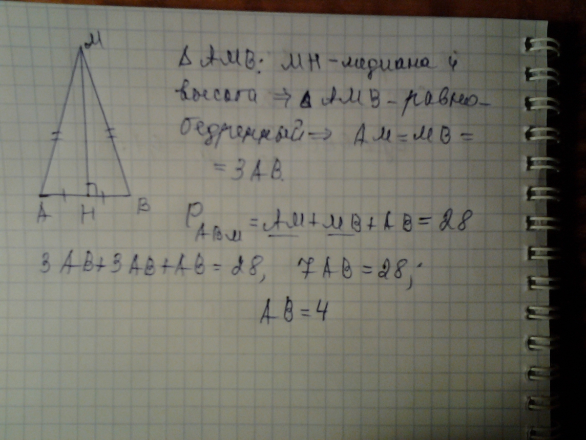 на серединном перпендикуляре к отрезку АВ отмечена точка М так что АМ=3АВ. периметр треуголника АВМ равен 28 см. найти длину отрезка АВ
