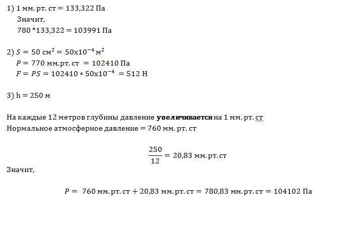 1)Атмосферное давление равно 780 мм рт. ст. Выразите его в паскалях.