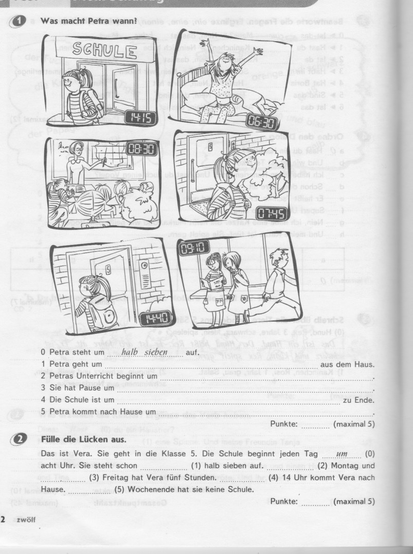 1. Viertel vor acht. Halb neun. Zehn nach neun. Viertel nach zwei. Zwanzig vor drei.
