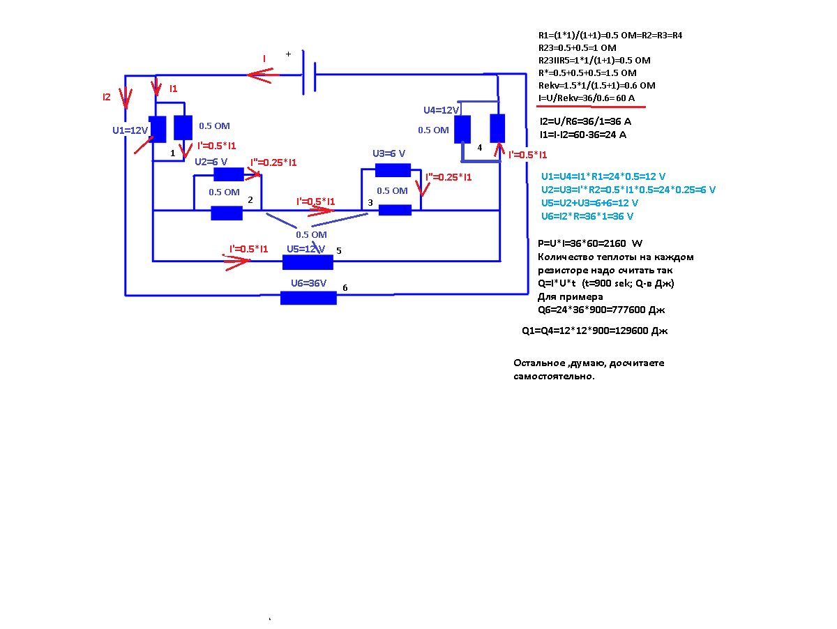 цепи.2)Найдите силу тока цепи и на каждом резисторе.3) найдите напряжение на каждом резисторе и количество теплоты,выделенное каждым резистором за 15 минут. Помогите,я вообще ничего не понимаю!!!