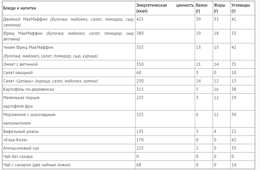 Меню: 1) Чикен Фреш МакМаффин - 355 ккал; 42 г - углеводы