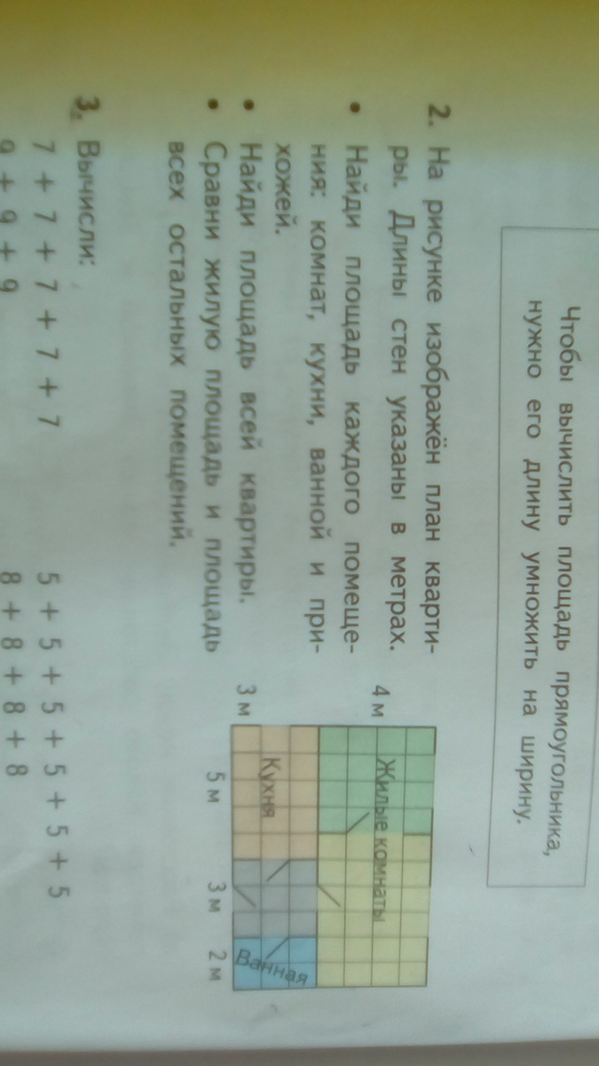 Кухня 3*5=15(м2), прихожая 3*3=9(м2), ванна 3*2=6(м2).