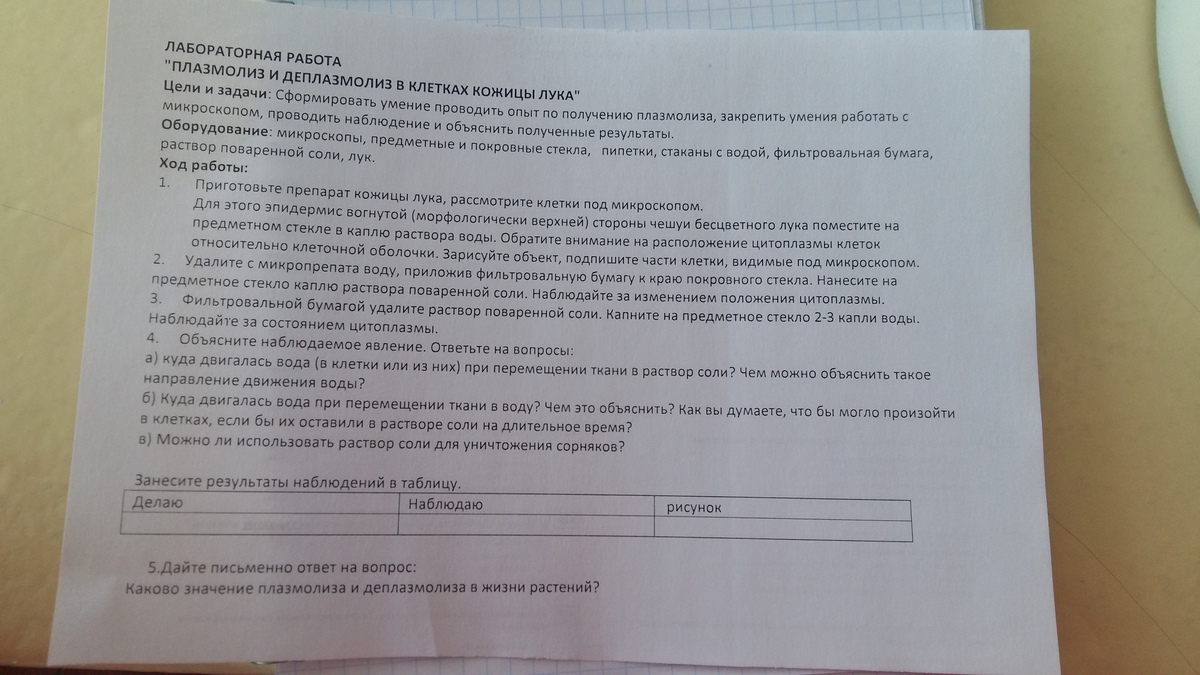 1. Делаю: погружение клетки в солевой раствор; Наблюдаю: плазмолиз; Рисунок; сморщенная клетка