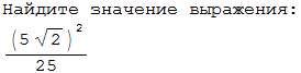 frac{(5 sqrt{2})^2 }{25} = frac{5^2*( sqrt{2})^2 }{5^2} =( sqrt{2})^2=2