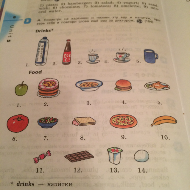 Посмотри на картинки и назови эту еду и напитки(по английски) 1)вода2)кофе3)чай4)молоко5)яблоко6)торт7)суп8)рыба 10)помидор11)салат12)бутер брод13)пицца14)банан15)конфета16)шоколад17)йогурт18)яйцо