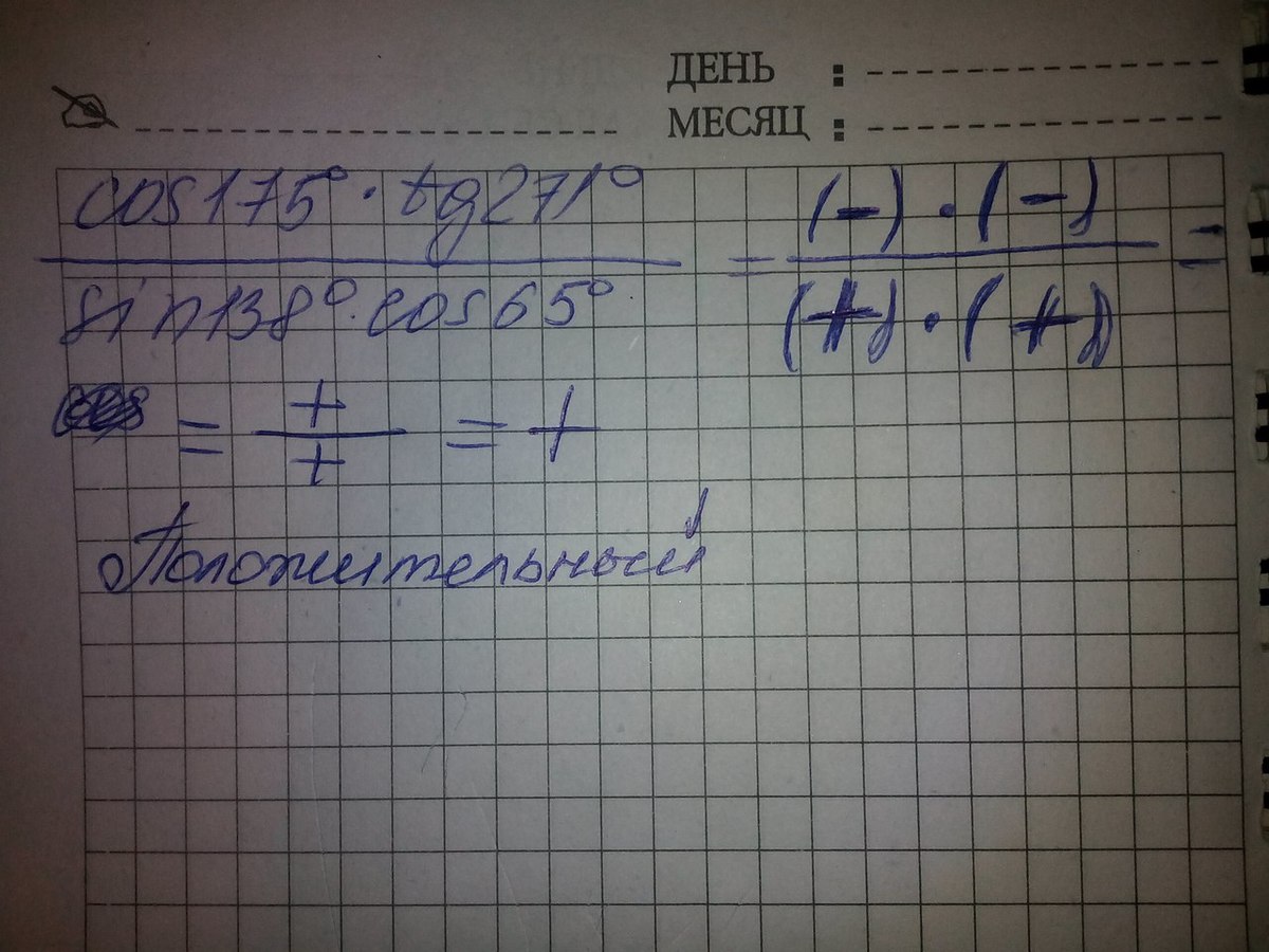 cos175- 175 принадлежит 2 четверти, где косинус отрицательный; tg271 - 4 четверти, где тангенс отрицательный; sin138 - 2 четверти, где синус положительный и cos65 - 1 четверти, где косинус положительный. В числителе получаем минус*минус = плюс, в знаменателе плюс*плюс=плюс, делим: плюс/плюс=плюс.