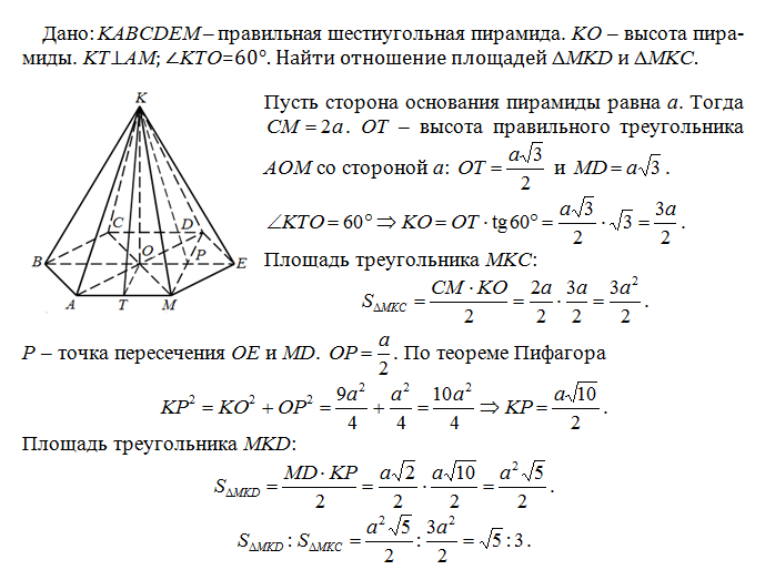 Дано: KABCDEM - правильная шестиугольная пирамида. КО - высота пирамиды. KT⊥AM; ∠KTO=60°. Найти отношение площадей ΔМКD и ΔMKC.