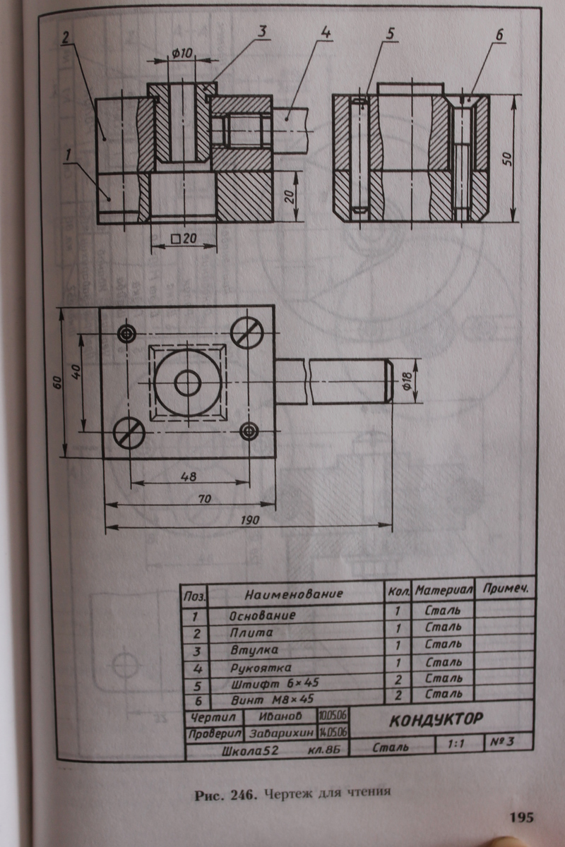 Последовательность сборки: втулку 3 запрессовывают в плиту 2, полученное соединяют с основанием 1 штифтами 5 и затем вкручивают винты 6. Напоследок ввинчивают рукоятку 4.
