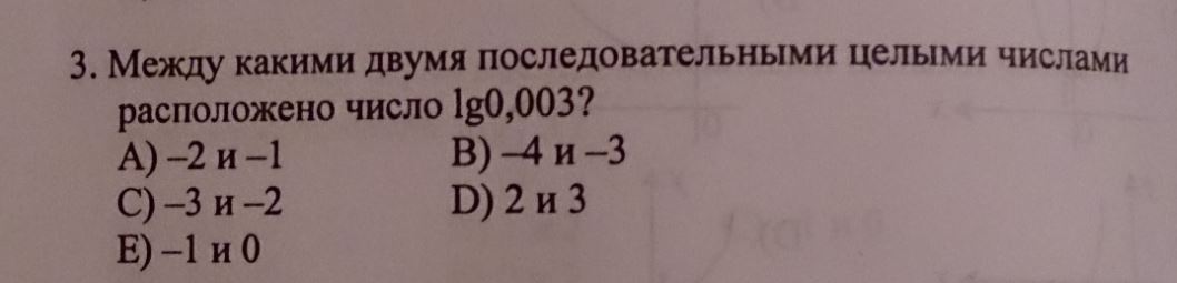 lg3=0,48 на калькуляторе. Можно логически: lg3 меньше единицы. Следовательно, lg0,003 больше -3 и меньше -2.