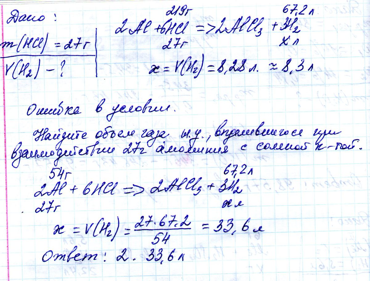 Найдите объем газа н. у., выделившегося при взаимодействии 27 г соляной кислоты с алюминием