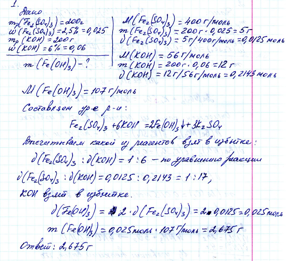 К 200 г 2,5%- ного раствора сульфата железа(III) прилили 200 г 6%-ного раствора гидроксида калия. Вычислите массу образовавшегося осадка.