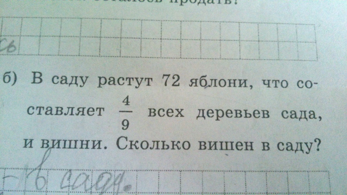 72 : 9 * 4= 32 ДЕРЕВА РАСТУТ В САДУ