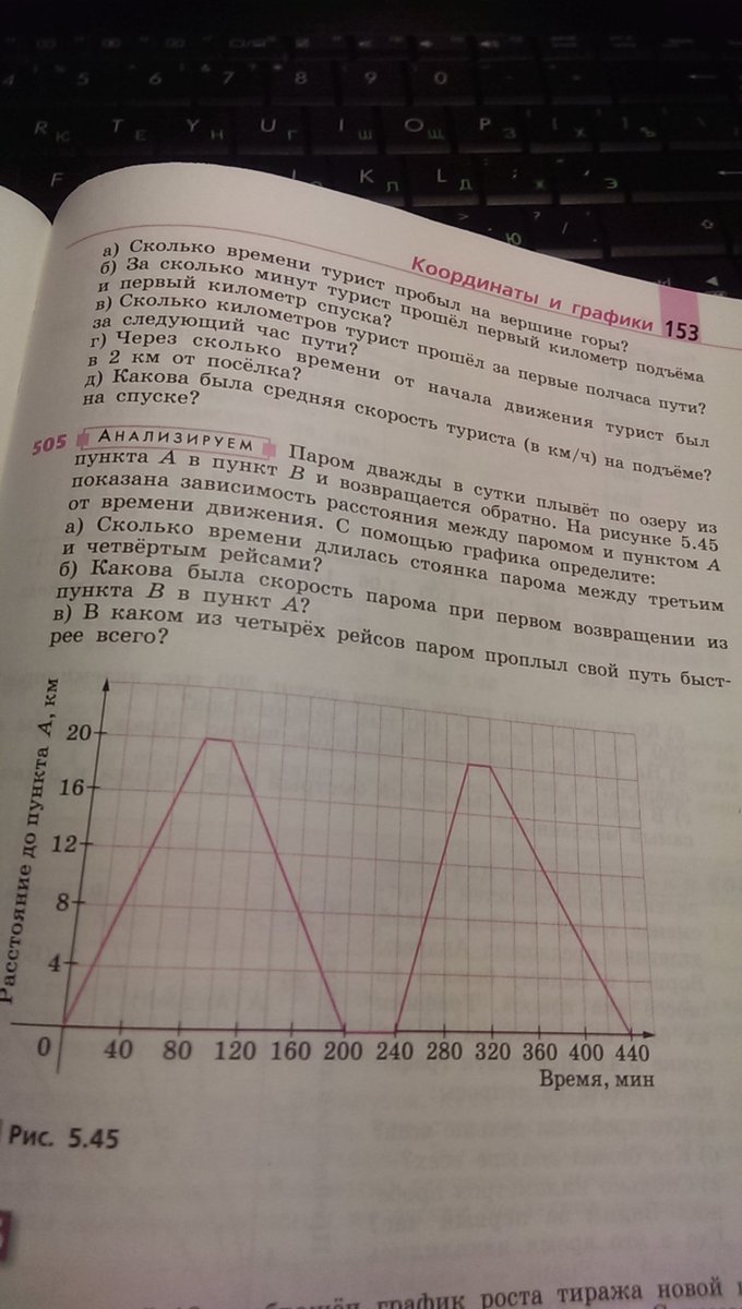 паром дважды в сутки плывет по озеру из пункта А в пункт В возвращается обратно.а)сколько времени длилась стоянка парома между третьим и четвертым рейсами. б)каковы была скорость парома при первом возращении из пункта в в пункт А. ПОМОГИТЕ ПОЖАЛУЙСТА