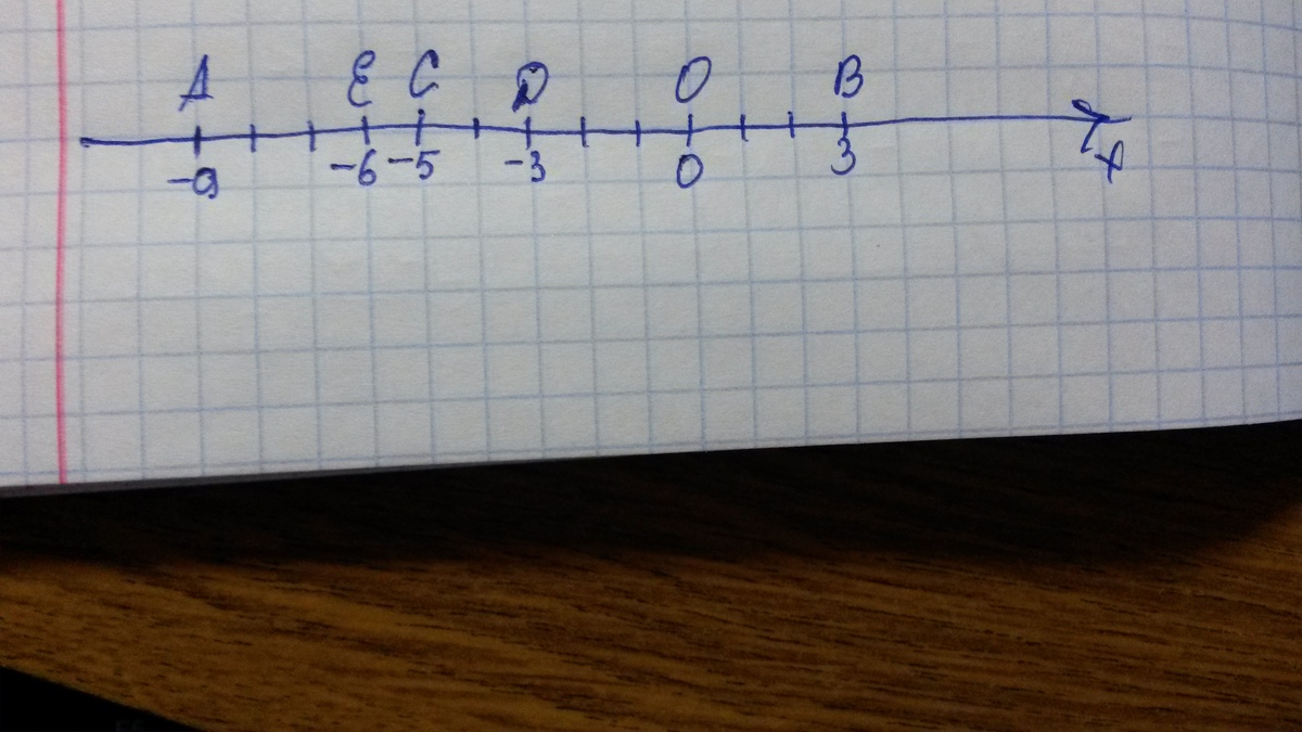 Изобразить еоординатную ось ( единичный отрезок-1клеточка тетради). Отметить точки: О(0), А(-9), В(3), С(-5), D(-3), E(-6) на координатной оси и вычислить длину отрезка: OA, BO, CB, EC, DC, OD, EA.