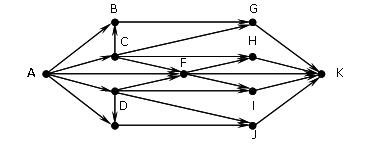 На рисунке – схема дорог, связывающих города A, B, C, D, E, F, G, H, I, J, K. По каждой дороге можно двигаться только в одном направлении, указанном стрелкой. Сколько существует различных путей из города А в город К?