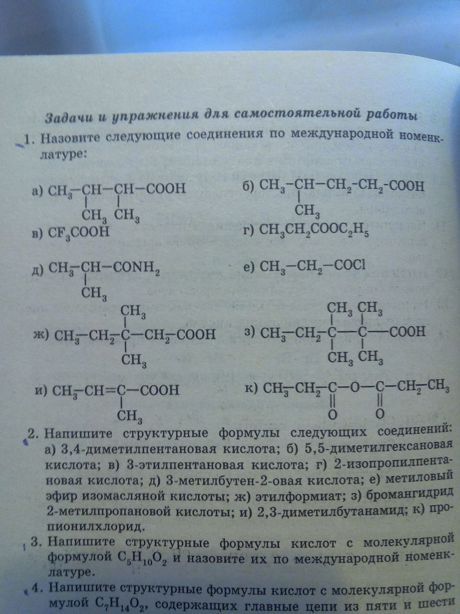 1. а) 2,3-диметилмасляная кислота ; б) 4-метилвалериановая кислота ; в) трифторуксосная кислота ; г) этилпропионат[этиловый эфир пропионовой кислоты] ; д) амид 2-метилпропионовой кислоты ; е) хлорангидрид пропионовой кислоты ; ж) 3,3-диметилвалериановая кислота ; з) 2,2,3,3-тетраметилвалериановая кислота ; и) 2-метилбутеновая кислота ; к) пропионовый ангидрид.