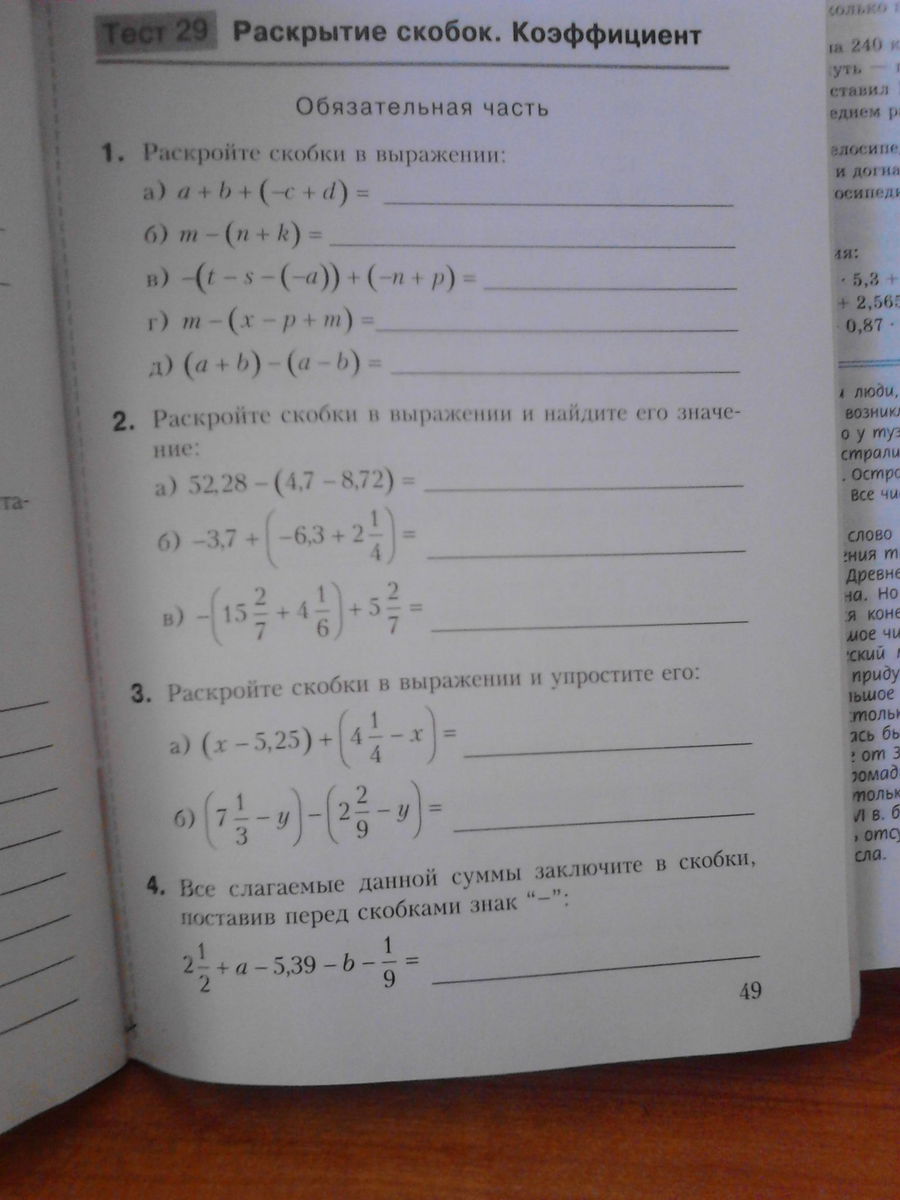 1. а)=а+b-c+d; б) =m-n-k; в)==-t+s-a-n+p; г)=m-x+p-m=-x+p; д)=а+b-a+b=2b. 2. a)=52,28-4,7+8,72=56,3 ;б)=-3,7-6,3+2 1/4=-10+2,25=-7,75 ;В) =-15 2/7-4 1/6+5 2/7=-10 2/7-4 1/6=-14 19/42. 3. а)=х-5,25+4 1/4-х=-5,25+4,25=-1 ;б)=7 1/3-у-2 2/9+у=7 1/3-2 2/9=5 1/9. 4. =-(-2 1/2-а+5,39+b+1/9)
