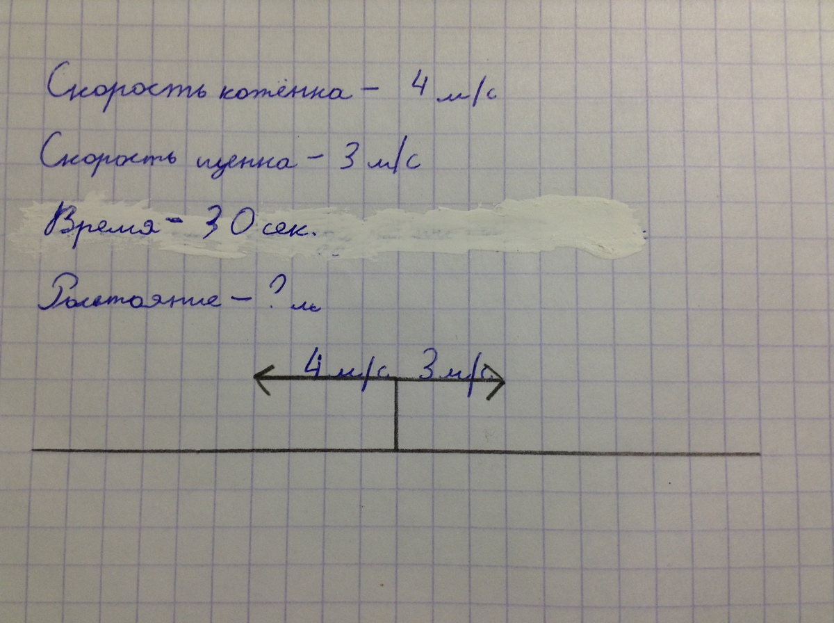 Решите задачу.Котенок и щенок выскочили из дома и побежали в противоположные стороны. Котенок побежал со скоростью 4 м/с, а щенок 3 м/с. На каком расстоянии друг от друга они окажутся через полминуты?