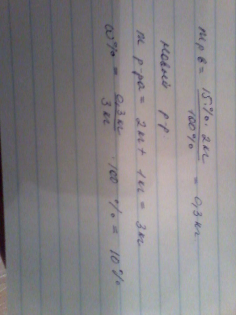 Какова массовая доля соли в полученном растворе, если к 2 кг 15 %- ного раствора соли добавили 1 кг воды?
