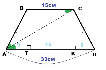 Трапеция ABCD : BC║AD; AB=CD; BC = 15 см; AD = 33 см