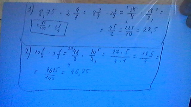 Вычислите: 8,75 умножить на 2 целых четыре седьмых – 10целых одна восьмая умножить на 3 целых 1/ 3. Все подробно напишите , пожалуйста !!
