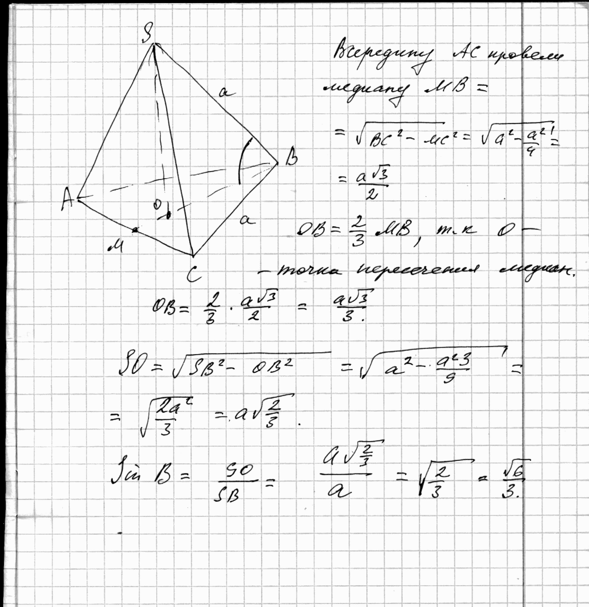 Для вычисления синуса искомого угла находим высоту тетраэдра.