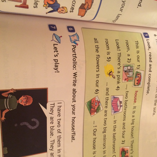 Next room is meine room. there is a bed, a chair, a table and tvset. The table is in the middle of the room. My chair is between the table and the bed. TVset is on the bedtable. And next room is livingroom. There is a sofa, a table and a TVset. TV is on the table. Sofa is in the middle of the room.