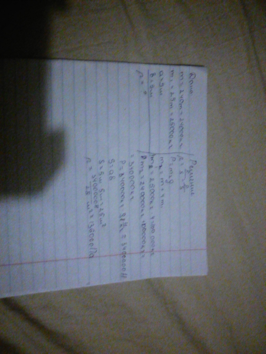 Вышка Кировского телецентра имеет массу 240т. и установлена на четырех бетонных опорах,имеющих в сечении форму квадрата со стороной 5м и массой 25т .Определите давление производимое вышкой на грунт?