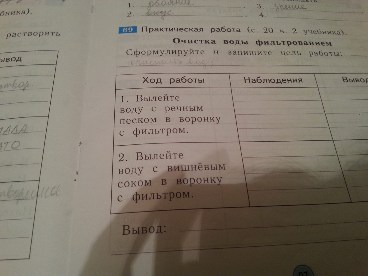 1) наблюдения: вода пройдёт через фильтр, а песок останется на фильтровальной бумаге(в фильтре). Вывод: частицы песка больше частиц воды, поэтому они задерживаются в фильтре.