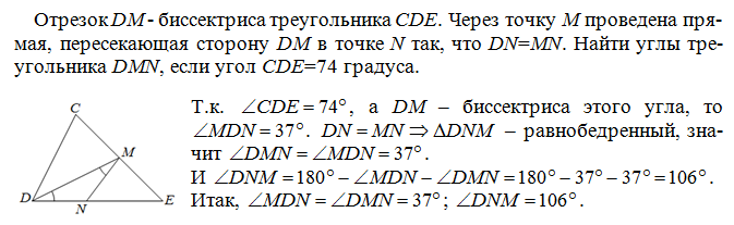 1. Отрезок DM - биссектриса треугольника CDE. Через точку М проведена прямая, пересекающая сторону DM в точке N так, что DN=MN. Найти углы треугольника DMN, если угол CDE=74 градуса.