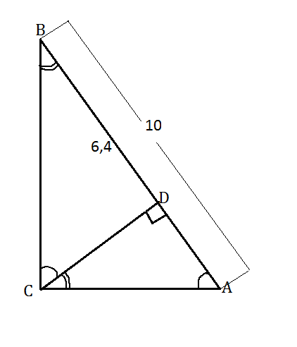 В треугольнике ACB (c вершиной С), угол ACB = 90 градусов, CD перпендикулярно AB. AB = 10 см, BD = 6,4 см. Найти CD, AC, BC.