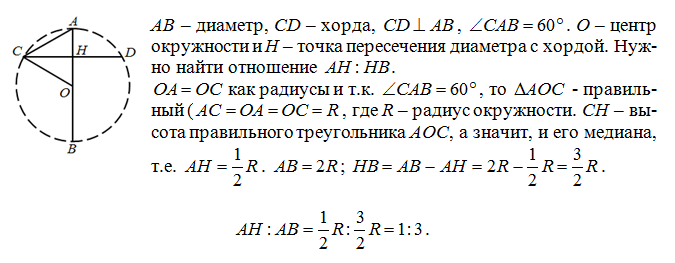 даны хорда и перпендикулярный ей диаметр. конец хорды соединен с концом диаметра отрезком, составляющим с диаметром угол 60 градусов. найдите отношение отрезков, на которые хорда делит диаметр.