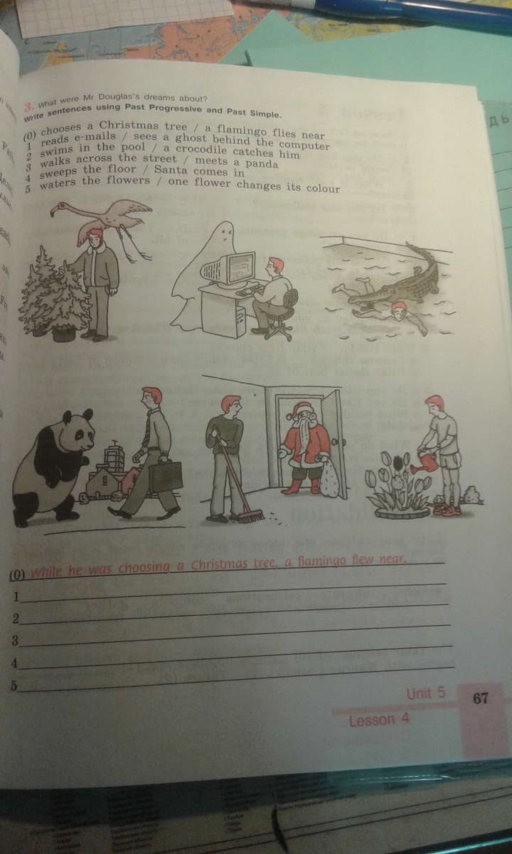 0. While he was сhoosing a Christmas tree, a flamingo flew near.