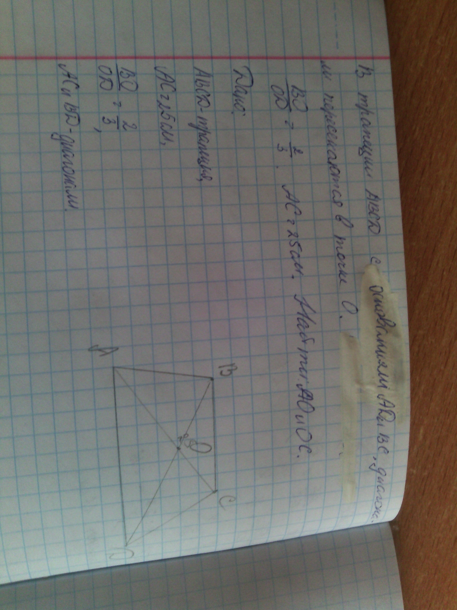 во первых там можно только по подобию треугольников доказать так как трапеция не написано что равнобокая а так ΔВОС подобен ΔDOA ∠O в треугольниках вертикальный соответственно равный, а ∠А и ∠С равны как накрест лежащие так как Δ подобны то BO/OD=OC/OA=2/3