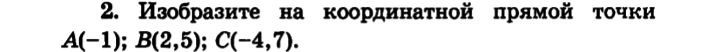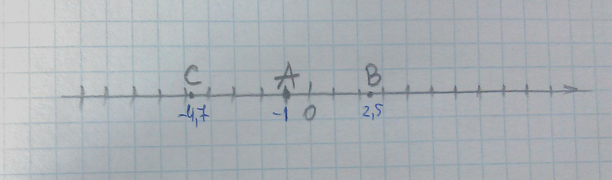 Начерти прямую, посередине поставь точку О-начало отсчета, левее её на одну клетку или см поставь точку А, правее точки О на 2,5 клетки точку В, затем левее точки О на(-4,7 )клетки поставь точку С.