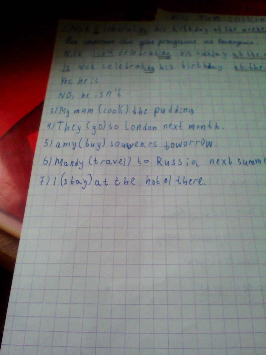 3. My mum is cooking the pudding. My mum isn't cooking the pudding. Is my mum cooking the pudding? 4. They are going to London next month. They aren't going to ... Are they going to..? 5. Amy is going to buy the souvenirs tomorrow. Amy isn't going to buy... Is Amy going to buy..? 6. Mandy is going to travel to Russia next summer. Mandy isn't going to travel... Is Mandy going to travel..? 7. I am going to stay at the hotel there. I am not going to... Am I going to..?