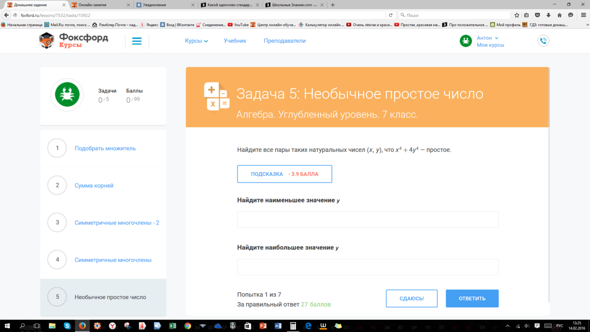 x = 7; y = 5; x^4 + 4y^4 = 4901