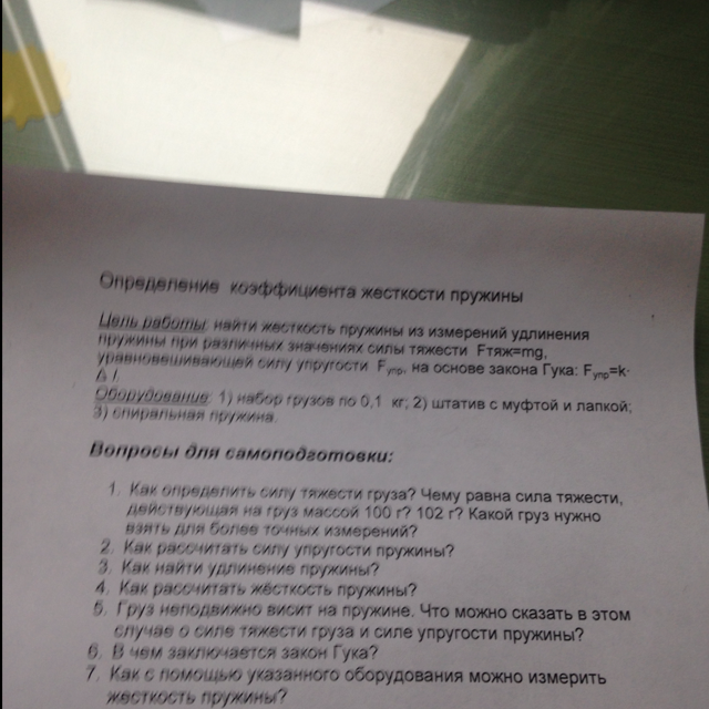 7. Как с помощью указанного оборудования (набор грузов по 0,1 кг., штатив с муфтой и лапкой ; спиральная пружина) можно измерить жесткость пружины?