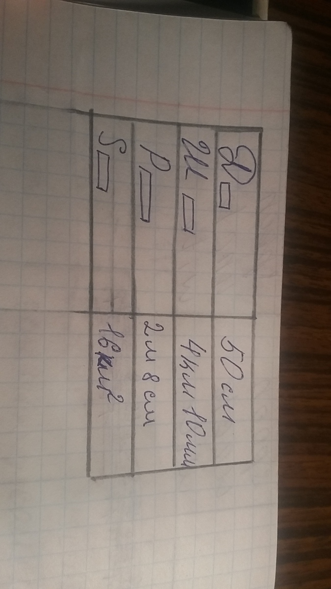 заполни таблицу: длина прямоугольника 50 см, ширина прямоугольника 4 км,10 мм, периметр прямоугольника 2 м, 8 см, площадь прямоугольника 16 км(2)