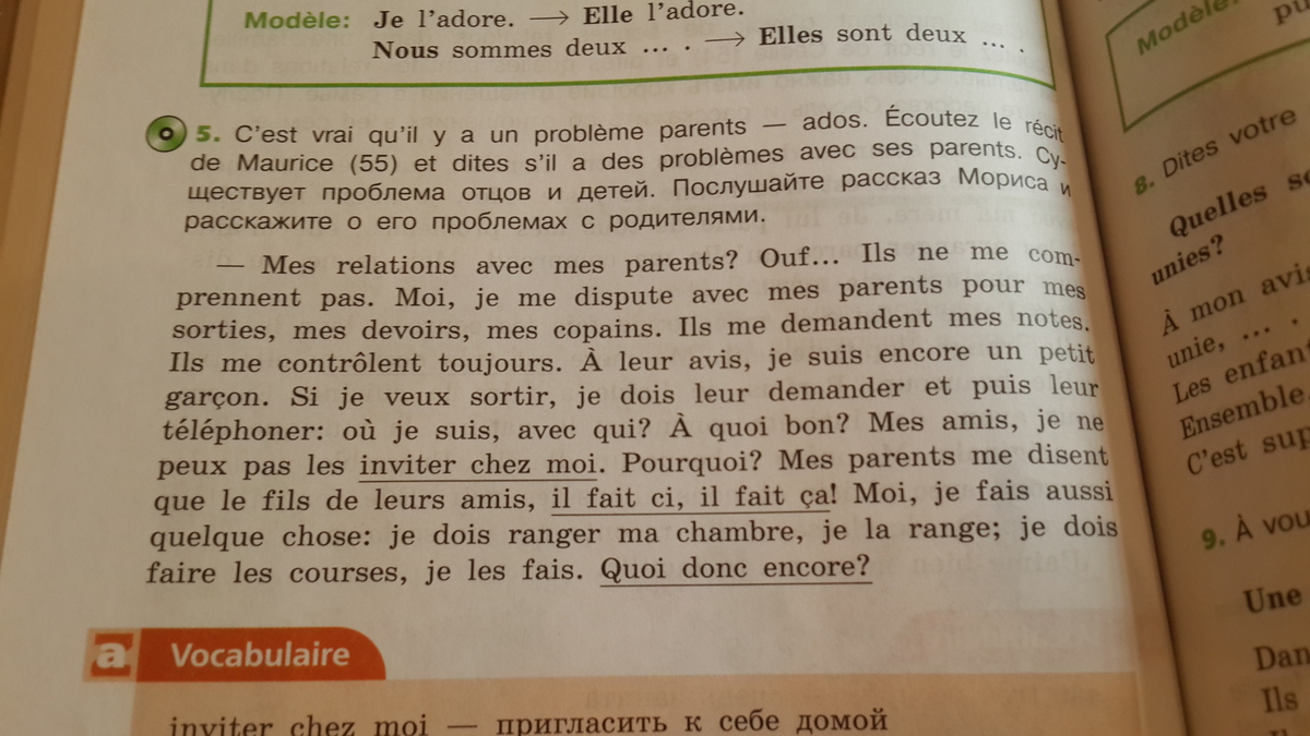 .Мои отношения с родителями? Уф... Они меня не понимают. Я ругаюсь с родителями из-за моих уходов (прогулок), из-за моих письменных домашних заданий, из-за моих друзей. Они спрашивают о моих отметках. Они всегда меня контролируют. По их мнению, я еще маленький мальчик. Если хочу уйти (пойти погулять), я должен у них спросить и потом им позвонить: где и с кем я. С какой стати? Я не могу пригласить к себе моих друзей. Почему? Родители говорят мне что сых их друзей делает то, делает сё. Я тоже кое-что делаю: я должен убирать свою коммнату, я ее убираю., я должен делать покупки, я их делаю. Чего же еще?