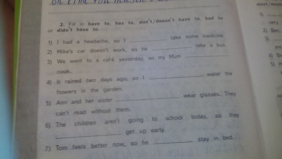 Fill in have to , has to , don't/doesn't have to , had to or didn't have to .