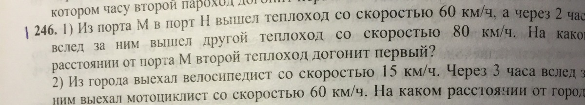 Разность в скоросте первого и второго 20 км/в. 120/20 = 6 часов будет второй догонять первый. Следовательно 6 часов * 80 км/ч = 480 км от порта М