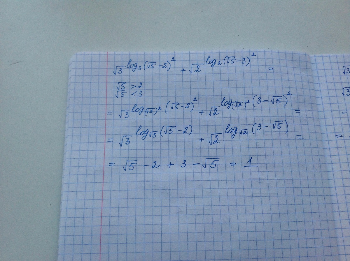 sqrt{3 }^{log3( sqrt{5}-2) ^{2} } + sqrt{2 }^{log2( sqrt{5}-3) ^{2} } =1