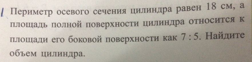Т.к. периметр осевого сечения равен 18, то имеем 2(2r+H)=18, 2r+H=9