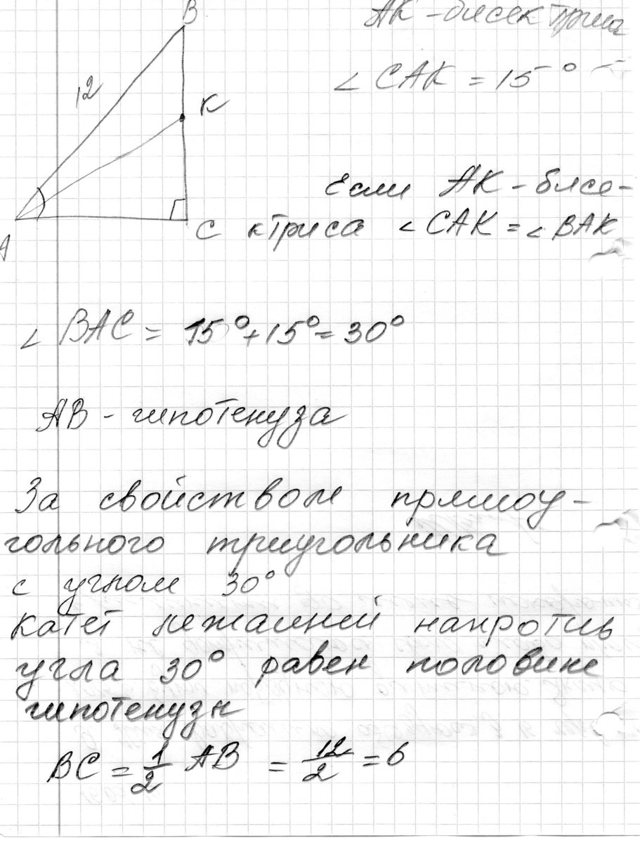 В прямоугольном треугольнике ABC угол C=90 градусов ,AK-бисскетриса угла A.Найдите длину катета BC,если гипотенуза AB=12 а угол CAK=15 градусов