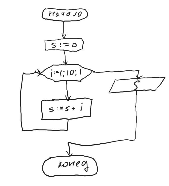Составьте блок схему алгоритма для задачи: Вычислите сумму ряда натуральных чисел от 1 до 10