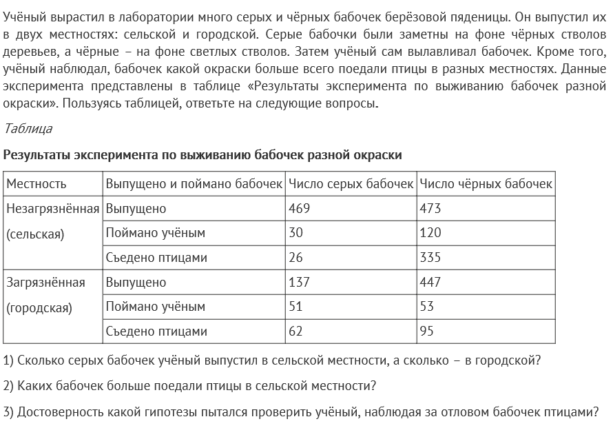 Учёный вырастил в лаборатории много серых и чёрных бабочек берёзовой пяденицы. Он выпустил их в двух местностях: сельской и городской. Серые бабочки были заметны на фоне чёрных стволов деревьев, а чёрные – на фоне светлых стволов. Затем учёный сам вылавливал бабочек. Кроме того, учёный наблюдал, бабочек какой окраски больше всего поедали птицы в разных местностях. Данные эксперимента представлены в таблице «Результаты эксперимента по выживанию бабочек разной окраски». Пользуясь таблицей, ответьте на следующие вопросы.