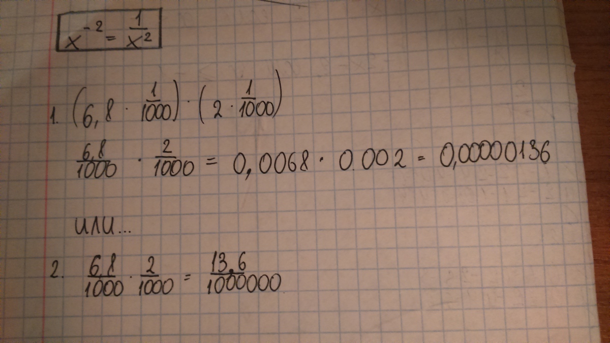 раскроем скобки: 6.8*10^-3*2*10^-3=10^-3*10^-3*2*6.8=по свойствам степеней, 10^-3*10^-3=10^-3-3=10^-6 далее=>10^-6 *2*6.8=10^-6*13.6=1/1000000*13.6/1=13.6/1000000