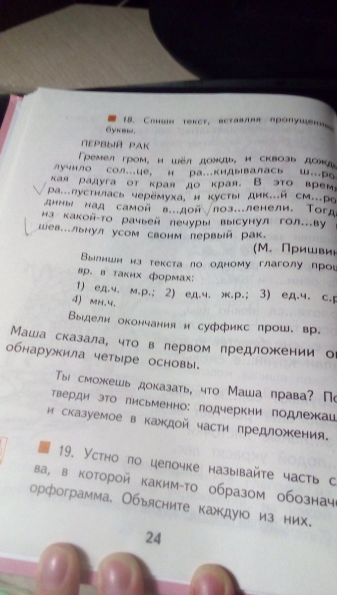 Гремел (сказуемое) гром (подлежащее) , и шел (сказуемое) дождь (подлежащее), лучило (сказуемое) солнце (подлежащее), и раскидывалась (сказуемое) широкая радуга (подлежащее) от края до края. В это время распустилась черемуха, и кусты дикой смородины над самой водой позеленели. Тогда из какой-то рачьей печуры высунул голову и шевельнул усом своим первый рак.