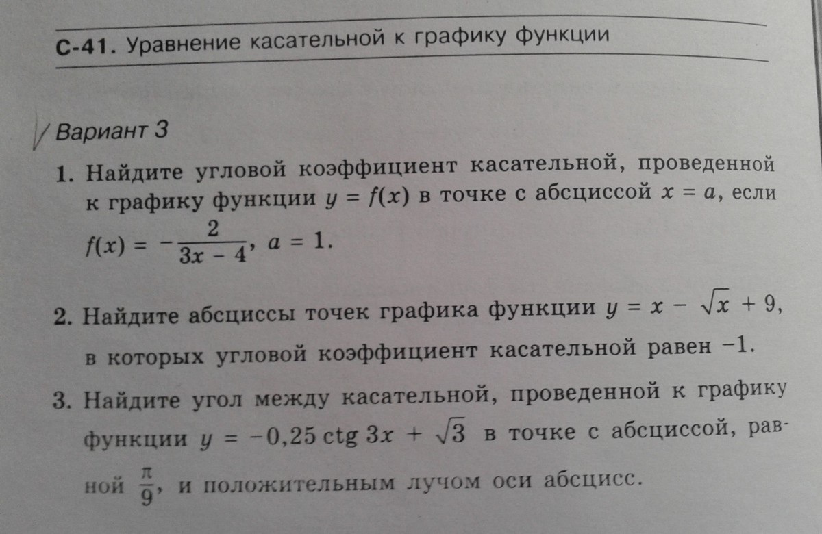 1) угловой коэффициент касательной - это значение производной в точке касания.